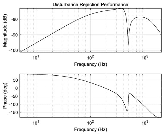 PI controllers are commonly used in real control systems for the tip-tilt control of FSM control systems. The tip-tilt controller is designed to achieve the designed gain margin, phase margin, crossover frequency, and loop gain. Although it is feasible to obtain a wider crossover frequency, the crossover frequency is limited by the sampling frequency of the DSP, feedback sensor signal, and other components. The open-loop transfer function of the designed PI controller for FSM control systems is illustrated in Figure 3, where the PI controller, crossover frequency, gain margin, phase margin, and loop gain are 91.1 Hz, 11.8 dB, 68.7°, and >30 dB, respectively. Moreover, the disturbance-rejection performance of the designed PI controller for FSM control systems is depicted in Figure 4. The transfer function of the PI controller is expressed as follows [35]: