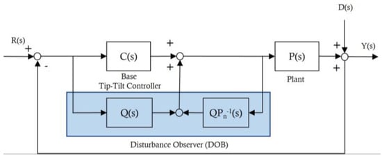 To avoid the abovementioned problems, an emerging basic approach to suppressing disturbances can be used that estimates the influence of an external disturbance independently by using a disturbance observer (DOB) and then eliminating the perturbation by using the feedforward method. This feedforward method is called the DOB method [24,25]. It has been applied to several mobile devices with High-precision control systems, such as robot motion control, swing arm actuators in hard disk drives, VCAs in optical disk drives, and permanent magnet synchronous motor control [26,27,28]. To improve the control performance of the original control system for use in FSM systems, high open-loop gain is needed in the dynamic disturbance frequency domain to sufficiently attenuate disturbances. FSM systems commonly use high-bandwidth proportional-integral (PI) controllers owing to their robustness to modeling errors and simple implementation [29,30]. The addition of a DOB to the base controller significantly improves the disturbance attenuation performance because of its simplicity and suitability for real-time implementation [31,32].