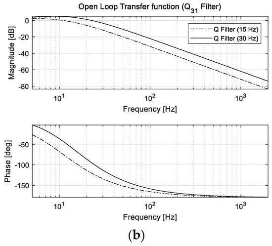 where τ is a time constant, ami denotes the binomial coefficients calculated as (m!/m − i)! i!, m is the denominator order, and n is the numerator order (m ≥ n). Generally, the robustness of the DOB improves as the denominator order increases. For example, if a Q31 filter is used instead of a Q20 filter, the robustness of the DOB system will improve. In addition, control system stability shares a trade-off relationship with the bandwidth of the Q filter. Therefore, the bandwidth of the Q filter must be selected experimentally to maximize the stability of the control system. For this reason, this study uses the binomial Q20 and Q31 filters in the proposed DOB-based controller for FSM systems, as illustrated in Figure 7. This is because the stability of the control system can be estimated from the residual control error signal (CES), which is the experimental result. The use of Q20 and Q31 filters effectively improves the disturbance-suppression performances of the FSM control system. Moreover, the disturbance-suppression performances of the FSM control system are effective in the low-frequency region with bandwidths of 15 and 30 Hz. The Open-loop transfer functions of the aforementioned Q20 and Q31 filters with bandwidths of 15 and 30 Hz are expressed as follows [34]: