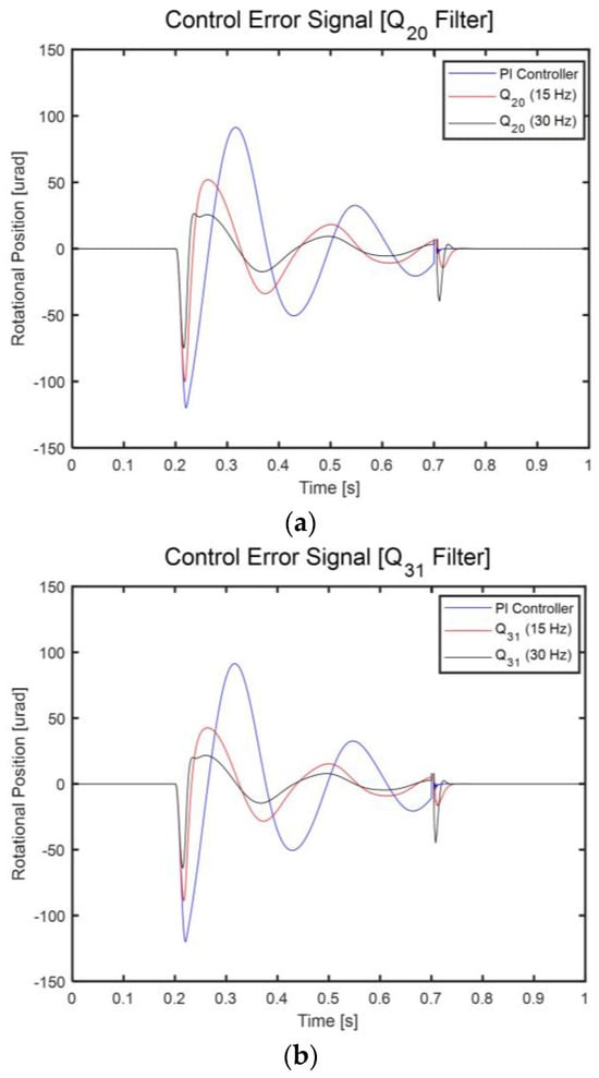 Simulated performance results obtained using DOB-based anti-shock controller for FSM control systems: (a) Q20 filter (15/30 Hz), and (b) Q31 filter (15/30 Hz).