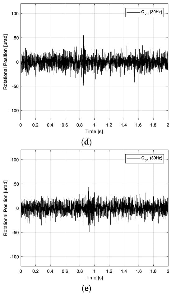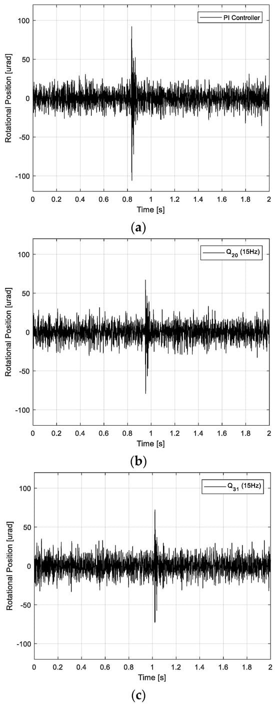 The experimental performance results are presented in Figure 11. The experimental performance results of the DOB-based anti-shock controller for FSM control systems revealed that the target rotational position was maintained successfully at 0 μrad (i.e., neutral rotational position). According to Figure 11a, the root mean square (RMS) residual CES of the PI controller was 9.9 μrad. When the 15 Hz bandwidth Q20 and Q31 filters were used in the DOB-based FSM control system, the RMS CES values were 100.1 and 88.8 μrad, respectively, as illustrated in Figure 11b,c. Furthermore, when the 30 Hz bandwidth Q20 and Q31 filters were used in the DOB-based FSM control system, the RMS CES values were 74.9 and 63.9 μrad, respectively, as illustrated in Figure 11d,e.