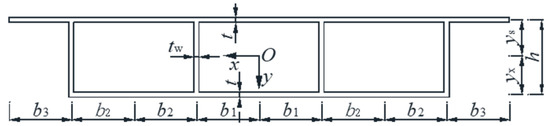 Considering the main girder with a single box and three chambers as the object of analysis, the force diagram of a thin-walled box girder under an arbitrary vertical load distribution is shown in Figure 1. The section coordinates and dimensions of the box girder are shown in Figure 2, where the center of the cross-section is the origin of the coordinate system, and the main inertial axes of the section are the coordinate axes.