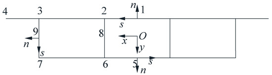 In thin-walled box girders, stress is assumed to be uniformly distributed along the wall thickness direction. For the study of thin-walled box girders, the position of any point on the section can be represented by the coordinates of the flow curve along the centerline of the thickness of the box wall, and the section of the thin-walled box girder can be simplified. A simplified section of the thin-walled box girder is shown in Figure 3, wherein the right-hand flow coordinate system is formed using , , and ; represents the displacement of the longitudinal -axis of the girder body, and represents the displacement of the circumferential -axis of the girder wall.