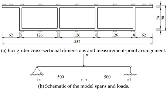 Figure 6 presents the structural dimensions, measurement-point arrangement, and loading effects of the aforementioned Plexiglas simply supported box girder test model [32]. The box girder test model had a span of . Its elastic modulus and Poisson’s ratio, which were measured from a test stretch, were and , respectively. The boundary condition was simulated by supporting steel columns of the same gauge underneath the bottom plates corresponding to all the web ends of the girder. Loads were applied on top of all the webs of the span section of the single-box, three-compartment, simply supported box girder using a loading system. A computer-controlled voltage jack with a load value of was used for the centralized force. Photographs of the loading system are shown in Figure 7.