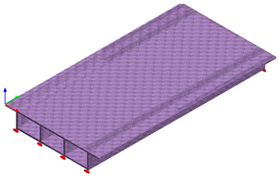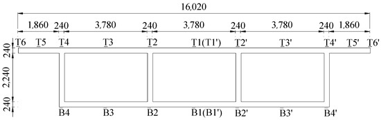 The MIDAS/FEA NX 2021 spatial finite-element software was used to build a solid simulation model of a single-box, three-chamber, simply supported box girder. The cross-section of the finite-element model was a single-box, three-chamber box section. The dimensions and arrangement of the measurement points are shown in Figure 8 and the space finite- element model are shown in Figure 9. Model tests used 120 resistance strain gauges to measure the longitudinal strain of the box girder under load. A total of 24, 15, and 9 strain gauges were, respectively, arranged on the cross-section, top plate, and bottom plate, and they were affixed to the surface of the box girder using structural adhesive. The measurement points of the finite-element model and locations of the measurement points of the experimental model had a correspondence; the span of the model was , and the material was C30 concrete with a Young’s modulus of and Poisson’s ratio of . In the finite-element model of the three-chamber box girder, three-dimensional hexahedral solid elements were used to simulate the main girder. The bridge had a total of 234,967 nodes and 157,395 solid units; the centralized load was applied at the top of the 4 webs of the cross-section of the finite-element model of the span, and the value of the load was .