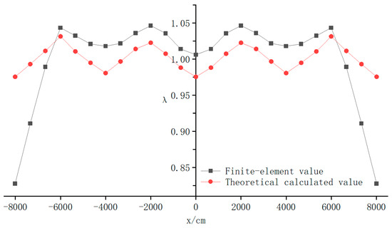 As shown in Table 3, when the value of the cantilever modification parameter is 1.6, according to the flexural displacement function derived in this study, the calculated shear lag coefficient values of the wing plate on the box girder at each point optimally coincide with the numerical simulation results of MIDAS/FEA NX and fully reflect the distribution law, indicating that the shear lag coefficient of the cantilever plate is smaller than that of the top plate. To more intuitively examine the influence of the correction parameter , the shear lag coefficient values of the wing plate on the box girder at the section were compared, as shown in Figure 11.