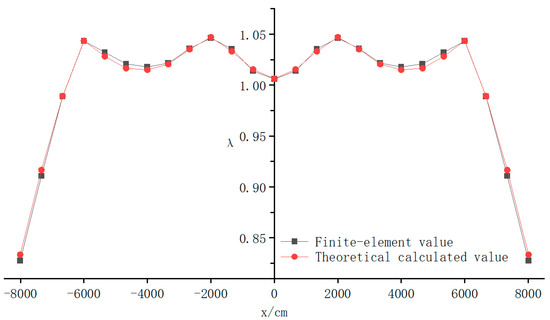 To obtain more accurate values of the shear lag coefficients, the value of the correction parameter of the cantilever plate must be determined by comparing the results of the numerical analysis calculations obtained via MIDAS/FEA NX and those obtained via the theoretical method for different values of , as well as the calculation of the upper-left wing plate of the finite-element model of a single-box, three-chamber box girder (). As shown in Figure 10, the parameter must be >1; thus, it was set as 1.0, and increased to 1.7 in steps of 0.1. The shear lag coefficients of the flexural box girder were corrected and calculated, and the results are presented in Table 3.