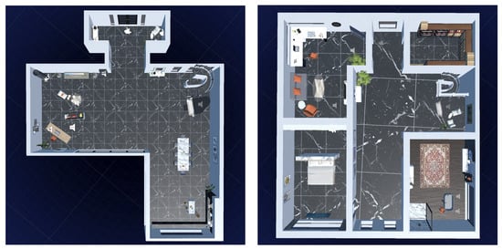 Game setting and room overview as a top-down view; each picture represents one floor where users can interact with the environment and switch between using the included stairs.