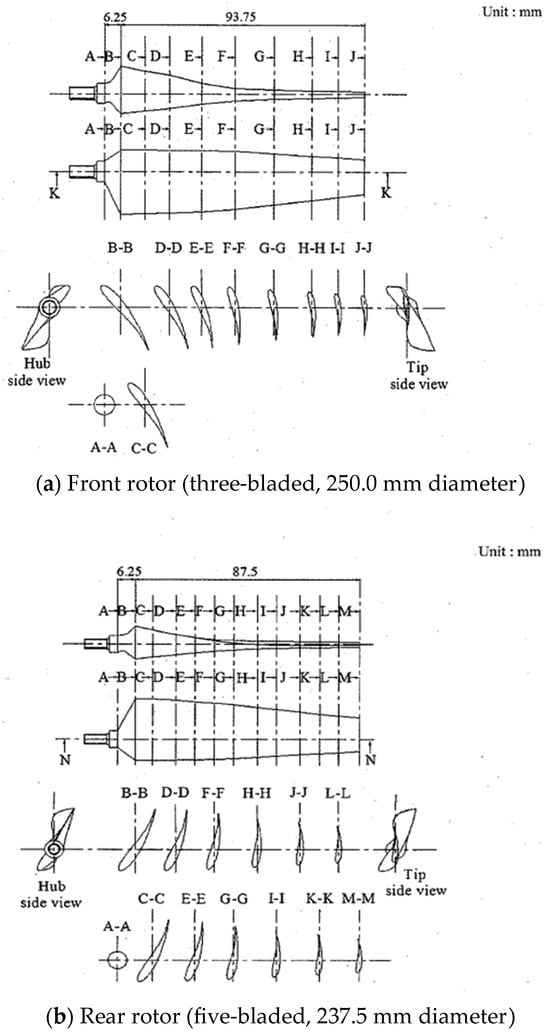Figure 2 shows the shapes of the FR and RR blades. The cross-sectional shape of these blades is depicted by the MEL002 airfoil [14], which has excellent characteristics in low-Reynolds-number regions.