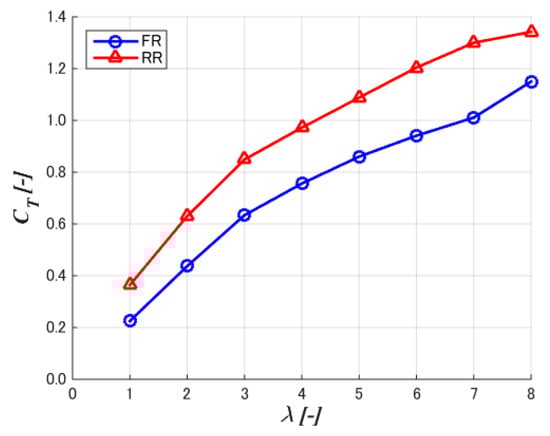The thrust coefficient of the RR is calculated as below by the individual rotor CFD results and the induced TSR in Equation (13).