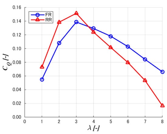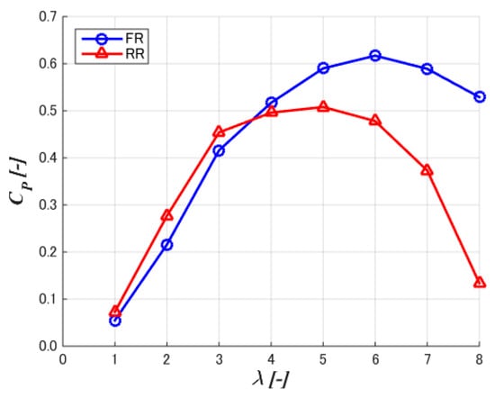 As shown in Figure 8, the TSR at which the maximum power coefficient of each individual rotor is obtained is approximately 6 for the FR. Even in the CCRR, the power coefficient of the FR tends to increase as the TSR increases, but the power coefficient of the RR tends to decrease from around 1.5, and the power coefficient of the CCRR saturates around 1.7. This is because, as the TSR increases, the thrust coefficient also increases (Figure 7), which increases the mutual induction factor. Therefore, overall, the TSR is significantly lower than in the case of a single rotor.