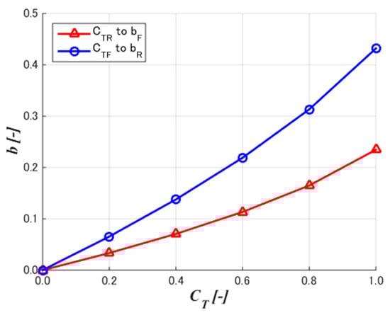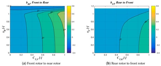 The mutual induction factor at the FR is calculated by the ADM results as below using the thrust coefficient of the RR in Equation (15).