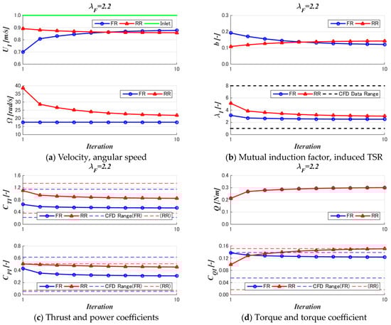 An example of the convergence status of the solution using the IRMI method is shown in Figure 13. In this example, the calculation is repeated 10 times, and it converges well. The dashed lines in the figure indicate the range of the CFD data.