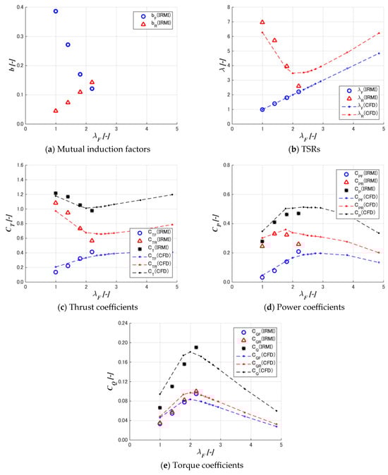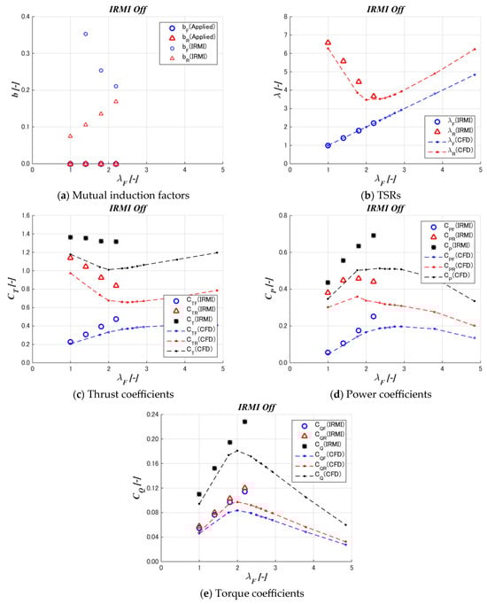 The analysis results considering the mutual induction factor, which is the original IRMI, are shown in Figure 15 together with the CFD results from Section 4. This condition considers the inherent mutual induction between the rotors, and the thrust of the FR reduces the speed of the RR by 4% to 12%, while the RR reduces the speed of the FR by 12% to 39%. When considering the mutual induction factor, the rotational speed (or TSR) of the RR decreases compared to when it is ignored. As a result, each aerodynamic coefficient is reduced, and the results are almost consistent with those of the MP model CFD.