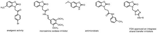 To solve this problem, it is necessary not only to raise the level of sanitation and hygiene and awareness of the use of antibiotic substances but also to search for new effective drugs with the fewest side effects. And this is where the chemistry of heterocycles comes in handy. Among them, benzoxazole pharmacophore, consisting a two fused oxazole and a benzene rings, occupies an important place as a promising target for medicinal chemistry, being a starting material for the synthesis of a number of biological and pharmacological active substances [4] which were found to exhibit antifungal [5,6], antituberculosis [7,8], anticancer [9,10,11], antileishmanial [12], anti-inflammatory-analgesic [13,14], and antibacterial [15,16,17,18,19,20] properties, and so forth [21,22,23,24,25,26]. Benzoxazole scaffolds have had a significant impact on drug discovery, and a variety of benzoxazole-based drugs are market-available nowadays [27,28,29]. Among benzoxazoles, the 2(3H)-benzoxazolone derivatives have been described as having diverse applications in medicinal chemistry [30] with large-scale therapeutic activities which include analgesic, anti-inflammatory, antimicrobial [31], cholinesterase inhibitors [32], antinociceptive [33], anti-HIV, antileishmanial, anticancer, antioxidant, antidepressant, and neurodegenerative [34] effects. Some pharmacologically active benzoxazole-2-one derivatives [35,36,37,38,39] are shown in Figure 1.