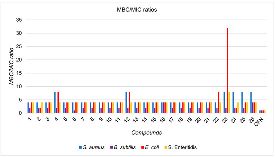 MBC and MIC ratios for compounds 1–26.