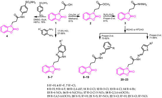 The study provides foundational synthetic procedures for subsequent compound development, opening the way for hit-to-lead optimization and structure-activity relationship data. Further studies are mandatory for a better understanding of the in vitro and in vivo safety, bioavailability, and tolerability of 3-(2-oxobenzo[d]oxazol-3(2H)-yl)propanoic acid derivatives, and new compounds based on this pharmacophore, which may help in the discovery of new selective antibiotics against various infectious diseases.
