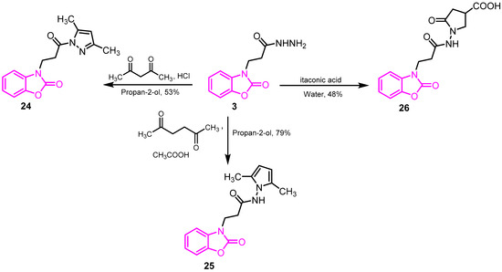 Analyzing the relationship between the structure and activity, it can be stated that the incorporation of 3,5-dimethylpyrazole, 2,5-dimethylpyrrole, and 5-oxopyrrolidine fragments in the molecules improved the growth inhibition activity of S. aureus, and 3,5-dimethylpyrazole (comp. 24) also selectively inhibited the Gram-negative strain of E. coli.