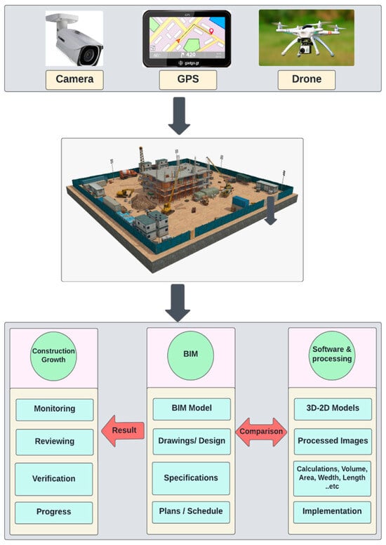 In modern construction operations, the integration of augmented reality technologies and data analysis plays a crucial role in improving project management and monitoring. By collecting data from drones and smart surveillance systems, aerial 3D images can be transformed into effective tools for scheduling activities, estimating costs, and tracking construction progress [28]. This smart approach to construction supervision allows for real-time performance analysis, facilitating the preparation of reports and continuous monitoring of plans with comparisons to actual progress. Additionally, these data are compared to Building Information Modeling (BIM) models, enhancing the accuracy of reports and facilitating responsive actions to problems and challenges during implementation [29]. This process works to reduce the effort and time consumed in construction monitoring while enhancing the quality and accuracy of reports and reporting violations and illegal behaviors. Consequently, this approach leads to improving planning and supervision processes, thereby enhancing the efficiency and effectiveness of construction project management [30]; see Figure 3.