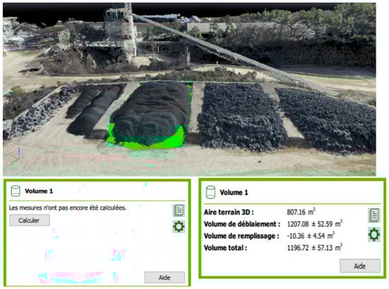 After taking a photo by using the drone and to calculate a volume in PIX4D, the area where the volume needs to be measures must be outlined. This involves creating a ground surface, encompassing the object or area to be measured. PIX4D then calculates the volume by comparing the elevation of this defined surface with a reference plane, typically the ground level around the object. For example, to calculate the volume of a pile of material, a surface can be drawn (indicated in green) around this pile. PIX4D then uses the differences in elevation between this surface and the base level to determine the volume of the material contained in the defined area. The volume of this pile is the cut volume = 1207.08 m3 with an uncertainty of 52.59 m3, representing a reliability of approximately 96%. As the Figure 8
