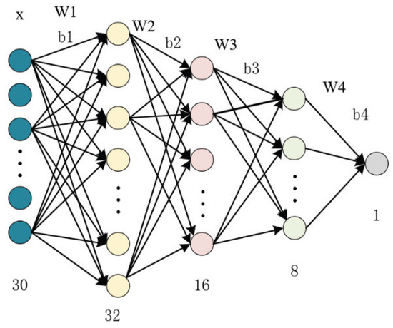 Federated-learning environment: An artificial intelligence model, which was built using Keras, consisted of four fully connected layers to form a neural network model. The data features consisted of 30 attributes, hence the input x was of size 30. The four-layer neural network was composed of 32, 16, 8, and 1 neurons. The data used in this experiment were from the Credit Card Fraud Detection dataset (from Kaggle), which contains records of credit card transactions made by European cardholders over two days in September 2013. The dataset consists of 285,299 entries, with 284,807 transactions and 492 suspected cases of fraud. The machine learning model in this experiment was built using Keras, and employed four fully connected layers to construct the neural network model structure illustrated in Figure 3.