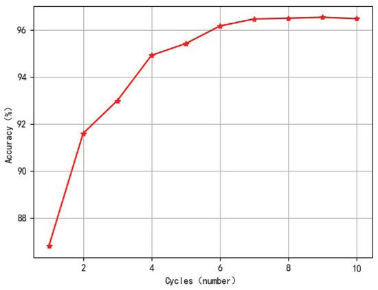 The convergence curve of the model is shown in Figure 4. From the figure, it can be seen that the model converged after the seventh iteration, achieving a precise model accuracy. Therefore, in this experiment, the number of training epochs for federated learning was greater than seven.