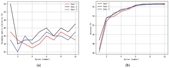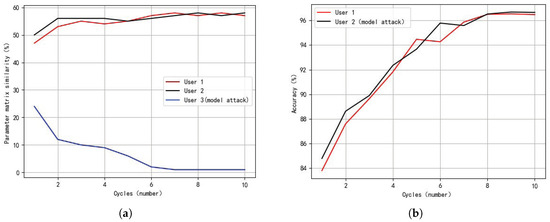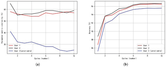 Model training with an unreliable user. (a) The similarity of the parameter matrices. (b) The model accuracy.