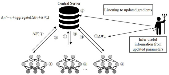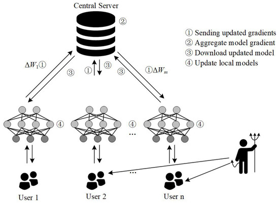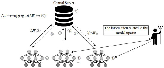 Federated learning (FL) [7] is a distributed machine learning technique that involves training a shared artificial intelligence model collaboratively across multiple devices. During this process, training data (or private data) remain stored locally on the devices, with local models being uploaded to a server for the aggregation of all models [8,9]. In federated learning, training data are kept locally, and the central server receives gradient information to update the global model. Data collection, storage, and server training are separated, thereby ensuring the security of private data. Introducing federated learning into crowd-sensing applications becomes particularly crucial in addressing privacy concerns that arise from user data uploads [10,11].