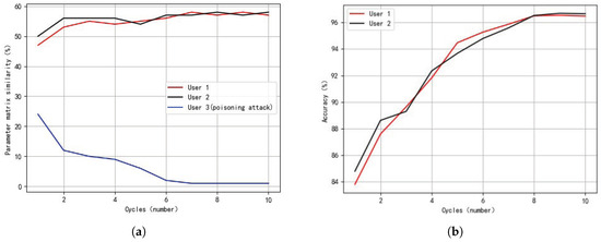 As shown in Figure 8, the training data used by the malicious user for the poisoning attack consisted of either malicious or tampered data, which differed significantly from the data of other normal users. By comparing the similarity of the parameter matrices, it was evident that the malicious user’s parameter matrix similarity was lower compared with the normal users. Consequently, their corresponding user contribution level decreased, leading to a smaller proportion in the model aggregation. Although the poisoning attack slowed down the convergence of the model, after convergence, the malicious user that employed the poisoning attack method hardly affected the overall model accuracy.