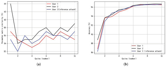 Model training with a user that conducted an inference attack. (a) The similarity of the parameter matrices. (b) The model accuracy.