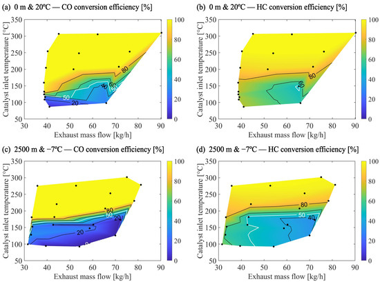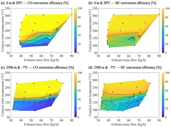 The results of the CO and HC conversion efficiency of the experimental tests for both warm sea-level and cold altitude cases are shown in the contour maps in