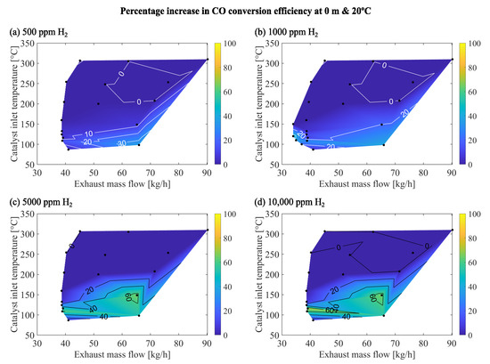 , such as 500 ppm, the enhancement in conversion efficiency was negligible and limited to regions with low exhaust mass flow and temperature, where the concentration of CO and inhibition were reduced. However, as the