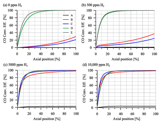 Figure 6 presents the axial distribution of CO conversion efficiency along the monolith length for points A–E. Each subplot within