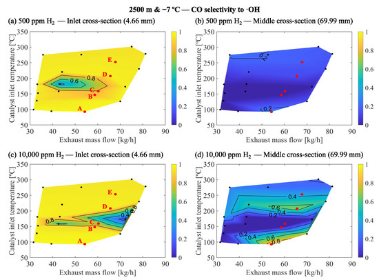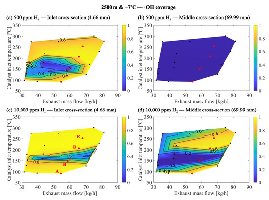 Moreover, at high temperatures, ·OH coverage neared saturation at the inlet. These areas did not benefit from further introduction. Conversely, low-temperature regions also reached ·OH saturation, but the prevailing temperatures were too low for significant reactivity, hence not benefiting from increased concentration. Therefore, it is evident that certain operating points do not gain from , whereas those that do require higher molar fractions for cold high-altitude conditions compared to warm sea-level conditions. This is mainly due to the higher CO molar fractions in these conditions, which necessitated higher molar fractions to stabilize sufficient ·OH coverage to guarantee the abatement of CO.