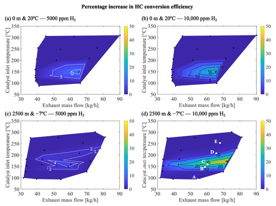 Figure 9 shows an improvement in HC conversion efficiency under warm sea-level and cold high-altitude scenarios. This figure illustrates the percentage increase in HC conversion efficiency as a function of the mass flow rate of exhaust gas and the inlet temperature, particularly at high molar fractions of