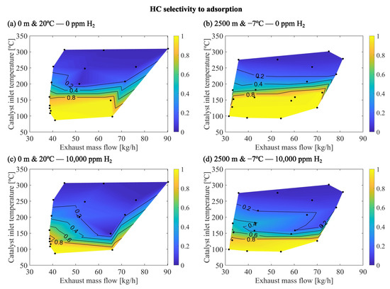 were introduced, the selectivity adsorption significantly decreased in the area with temperatures around 140–150 °C and exhaust mass flow of 60 to 65 kg/h, falling from 100% with 0 ppm of