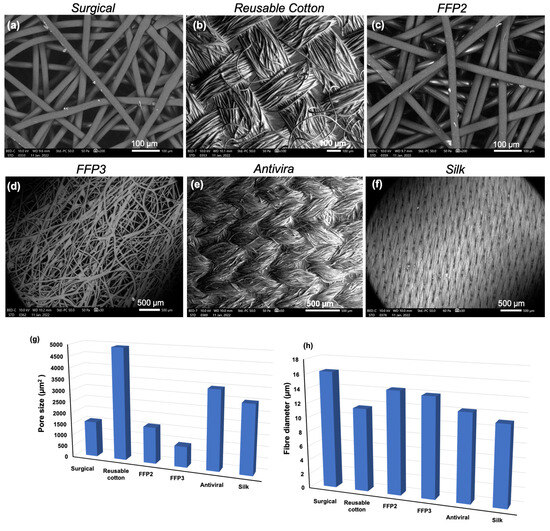 SEM images of six different mask surfaces. (a,c,d) Surgical, FFP2, and FFP3 with randomly orientated fibers. (b,e,f) Reusable cotton, antiviral, and silk with woven or ordered fabrics. (g,h) Graph showing the pore sizes and fiber diameters of masks.