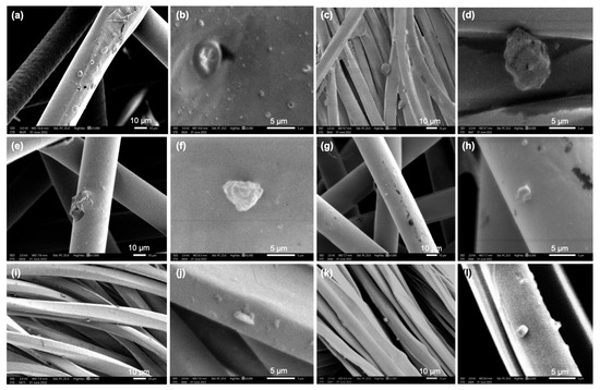 Figure 2a–f show SEM micrographs displaying porosity in both woven and random fiber structures. Pores lie between the cross weave and within overlaying fibers with random orientations. Figure 2a,c,d are randomly orientated fibers, and Figure 2b,e,f are woven or ordered fabrics. The average pore sizes vary within the different mask layers, as indicated in Table 1. Further structural details have been reported earlier by Rasekh et al. (2022) [36].