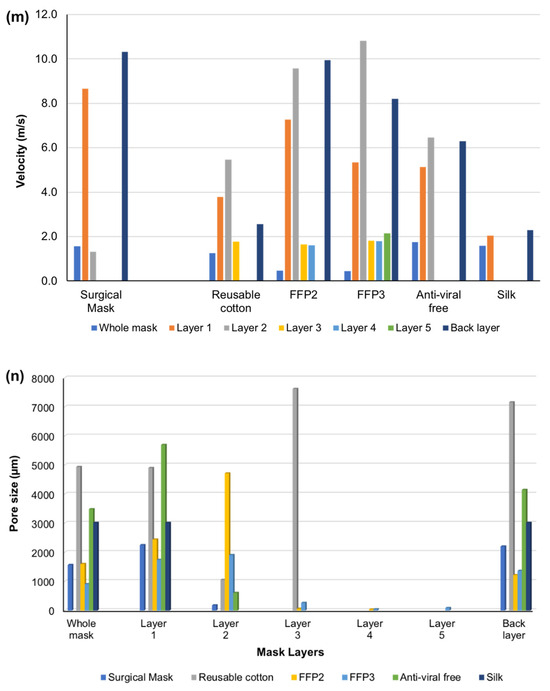Figure 3n demonstrates the average pore size of each mask as a whole and for its individual layers. The first block of bars applies to the six whole masks, followed by individual layers depicted by the color key. As whole masks, the FFP3 was the least porous (912 µm), whereas the Reusable Cotton was the most porous (4936 µm).