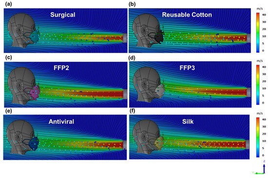 CFD simulations showing the velocity profile and the droplets size distribution from the source to the wearer while wearing masks. (a) Surgical (light blue). (b) Reusable cotton (black). (c) FFP2 (purple). (d) FFP3 (grey). (e) Antiviral (dark blue). (f) Silk (yellow).