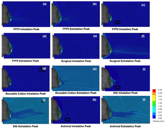 The air flow velocity distribution results inside the face mask wearer during the inhalation peak (t2 = 3 s) and the exhalation peak (t1 = 1 s) are shown in Figure 7. Overall, air flow velocities were higher inside the mask compared to outside for both inhalation and exhalation. During the inhalation phase (Figure 7a,c,e,g,i,k), all six face masks showed a low air velocity distribution (~0.8–1.4 m/s) inside the mask (within the nose and mouth). The Silk and Antiviral masks had a higher air flow velocity (2.3 m/s) around the mouth. However, during the exhalation phase, the air flow velocity was distributed evenly inside the FFP3, FFP2, and Surgical masks (Figure 7b,d,f)), whereas the air flow velocity was higher for the silk (Figure 7j) and antiviral (Figure 7l) face masks. Moreover, it can be observed that during the exhalation phase, more air passes through the Silk and the Antiviral masks (blue areas in Figure 7j,l). These results correlate with the high pore size and low filtration efficiencies measured for the Silk and Antiviral face masks [33].