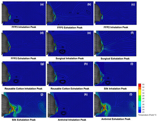 During the exhalation peak, both the silk (Figure 8i,j) and antiviral masks (Figure 8k,l) show a high-temperature area inside the mask. The increased temperature extends throughout the masks (red regions, 30–33 °C). This means that the resistance to air flow in these two types of masks is low compared to Surgical and Reusable Cotton. This also means less resistance to the air flow velocity distribution (Figure 7j,l) during the exhalation phase. Overall, the results obtained from the simulations are consistent when compared to the data in Table 2 and Table 3, indicating the high filtration efficiency of FFP3 and FFP2 in accordance with the standard EN 149 [31].