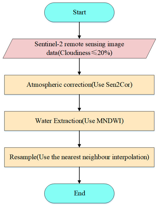 The remote-sensing image data downloaded in this paper are of Level-1C, and the Level-1C remote-sensing images are atmospherically corrected by Sen2Cor (V2.9), the Sentinel-2 image processing software provided by ESA, to produce Level-2A level remote-sensing image data. Furthermore, Sen2Cor does not process band 10 because it is a convolutional cloud band; as a result, the final result consists of 12 bands of data in addition to band 10. The final experimental data are obtained by resampling the processed Level-2A remotely sensed image data using nearest neighbor interpolation, after which modified normalized difference water index (MNDWI) is used to extract the watershed. The remote-sensing image data preprocessing process is shown in Figure 2.