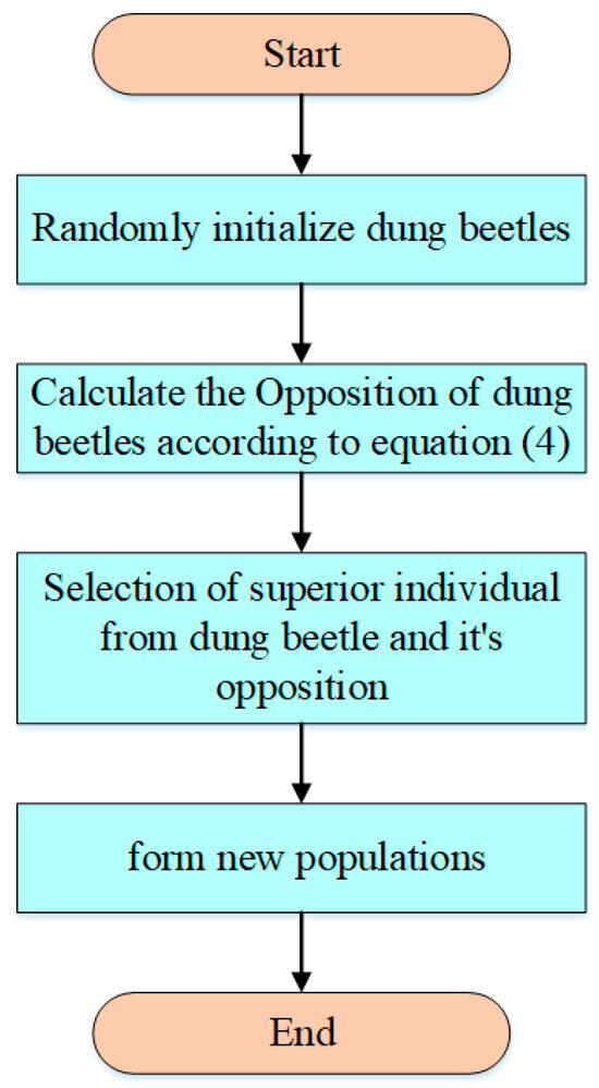 Figure 3 displays the population initialization flowchart for the improved DBO using the Obl strategy. By using Obl to generate the reverse population, the starting population’s search range is expanded, the algorithm’s global search capability is strengthened, and the initial population’s fitness is improved. These improvements hasten the algorithm’s convergence and shorten its computation time.