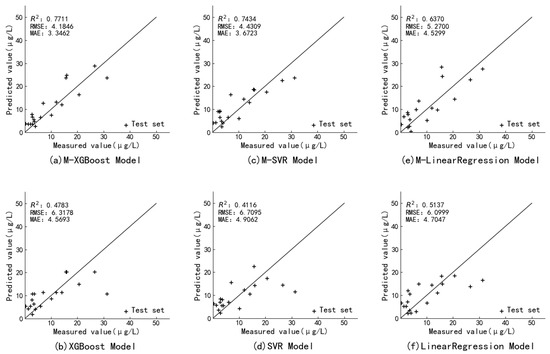Prediction results of the model for (a) M-XGBoost, (b) XGBoost, (c) M-SVR, (d) SVR, (e)M-Linear regeression, and (f) Linear regeression.