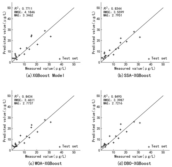 Prediction results of the model for (a) XGBoost, (b) SSA-XGBoost, (c) WOA-XGBoost, and (d) DBO-XGBoost.