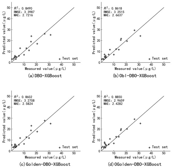 In order to verify the performance of OGolden-DBO-XGBoost in the inversion of Chl-a concentration with the introduction of the month feature, this paper compares the performance of DBO-XGBoost, Obl-DBO-XGBoost, Golden-DBO-XGBoost, and OGolden-DBO-XGBoost.