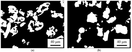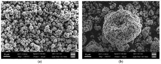 The Höganäs iron powders were provided with particle sizes up to around 150 μm. Therefore, prior to testing, they were screened to −38 μm (−400 mesh) in order to suit the SAS application requirements. Both powders have similar morphology (compare Figure 3c,d), but their internal structure is different. The NC100.24 grade has a spongy (porous) structure that originates from the fabrication process. The ABC100.30 grade, like the other atomized and carbonyl powders, is solid and may contain only microporosity that is hardly detectable by light microscopy (LM).