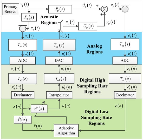 Single-rate systems and multi-rate systems are two commonly used kinds of traditional ANC systems [1,33]. In a single-rate system, the reconstruction filter and anti-aliasing filter are implemented with analog circuits that are typically composed of capacitors, inductors, resistors, and operational amplifiers. The transfer functions in acoustic regions from the primary source to the reference microphone and error microphone are denoted by and , respectively. The principles of a single-channel multi-rate ANC system are shown in Figure 1. The primary sound source reaches the reference microphone and error microphone after passing through and , respectively, and the corresponding signals are and , respectively. is the noise reduction target of ANC, and is the control signal given by the speaker. After passing through the secondary path of the sound field , the signal from the error microphone is . The transfer functions of the analog anti-aliasing filters are denoted by and , and the transfer function of the analog reconstruction filter is denoted by .