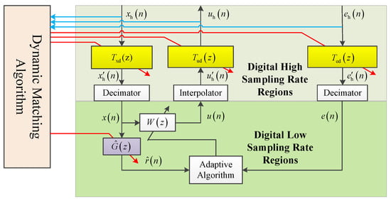 On the basis of a traditional multi-rate ANC system, a dynamic matching algorithm is added to the ANC process, which is responsible for acquiring , , and at specific time intervals. The intervals can be preset before the control starts; for example, they can be set to 1000 times the period of the low sampling rate or adjusted in the control state. The mirror noise portion of and the aliasing noise portion of and are estimated in the regions with the high sampling rate, and then appropriate values of , , and are selected from the constructed digital filter library to achieve adaptation. As may change with the variations in digital reconstruction and anti-aliasing filters, the dynamic matching algorithm needs to simultaneously adapt to to ensure the correct operation of the adaptive ANC algorithm in regions with a low sampling rate.